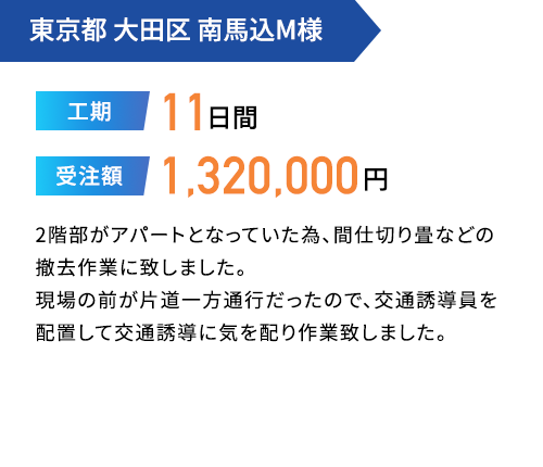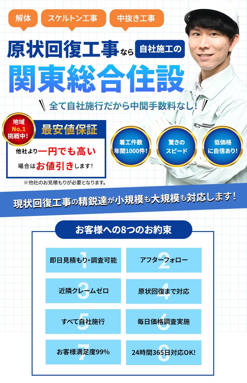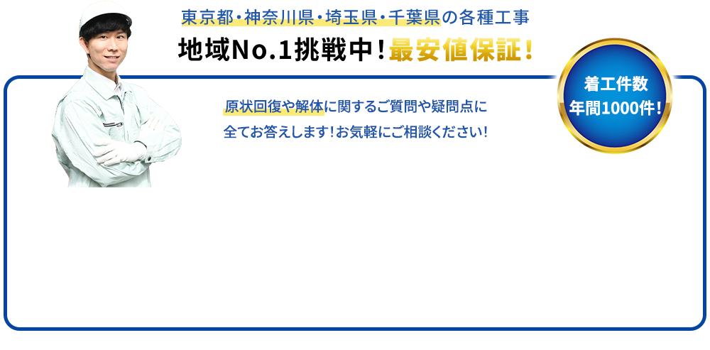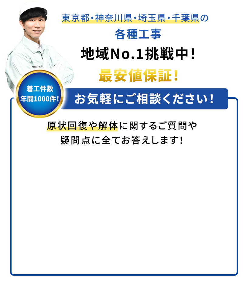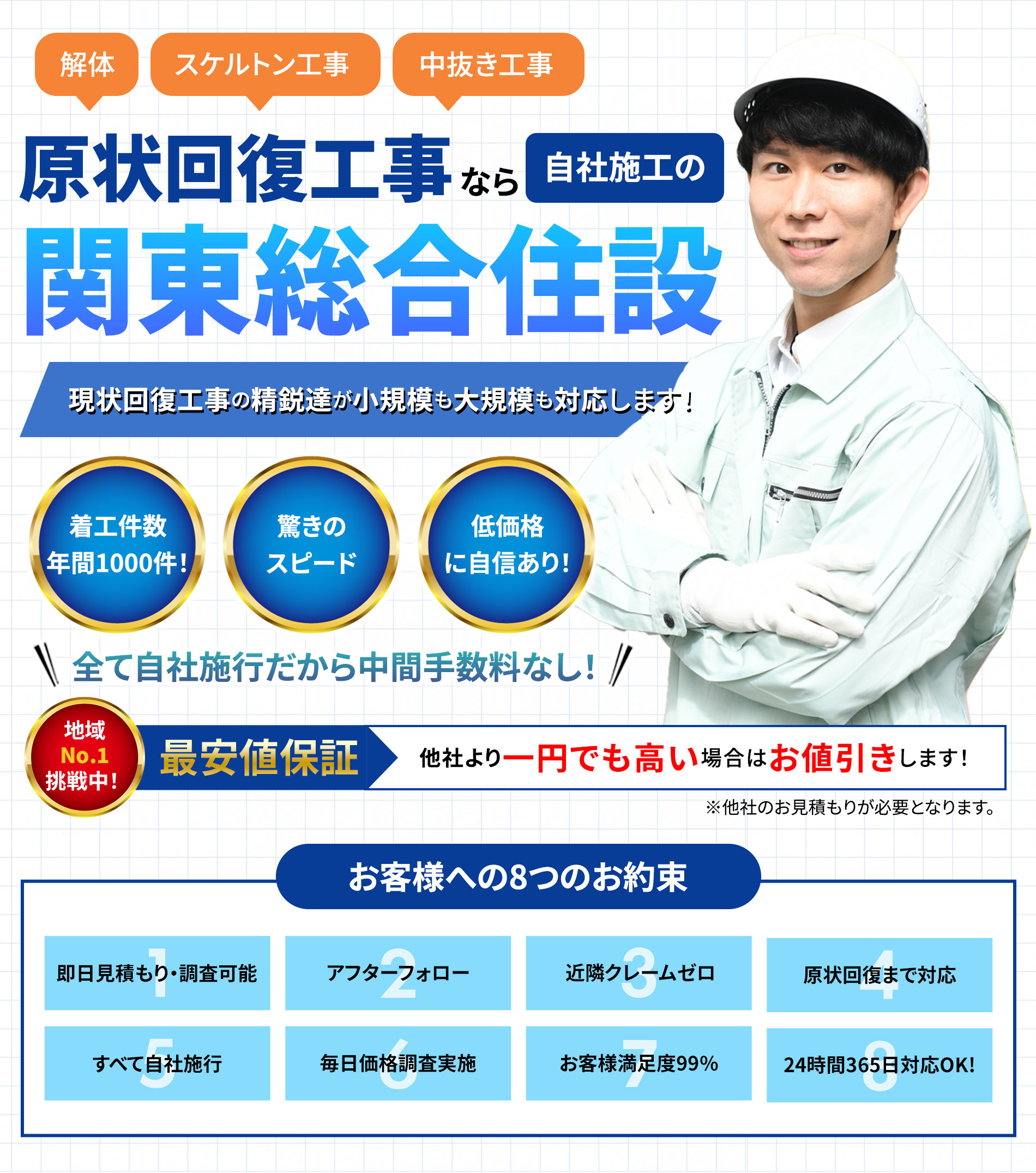 - A工事した際に、万が一建物内部の損傷や見積範囲外の工事が出てきてしまった場合、 その工事費用として、別途費用を別途請求させて頂く場合があります。また、見積もり作成時点になかった処分品が増えていた場合も別途追加される場合があります。