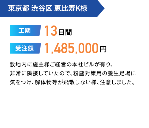 - 足場の組み立て(養生パネル、シートの選別)、近隣への粉塵対策・騒音・振動・防塵・安全対策を徹底し、 原状回復作業を行います。工事により生じた産業廃棄物を分別し、中間処理・最終処分施設へ搬出します。