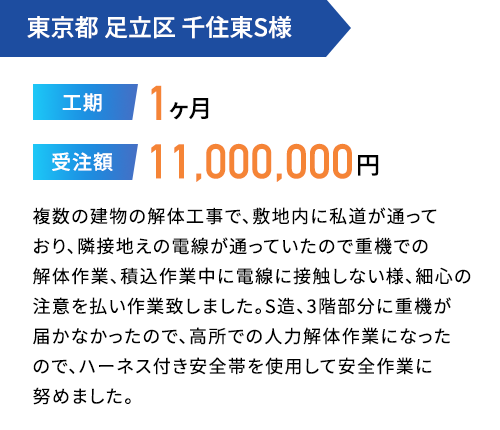 - 建物構造種別・解体作業・近隣環境・搬入ルート確認・隣接境界確認・地中物の有無を確認。