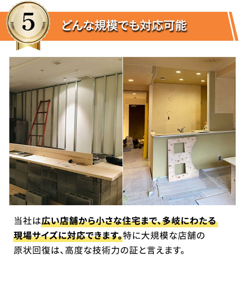 - A原状回復の場合、延べ床面積が80平米以上の建物に関しましては、 管轄の役所への届出義務がありますので、最短届出から7日後の工事着工になります。