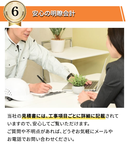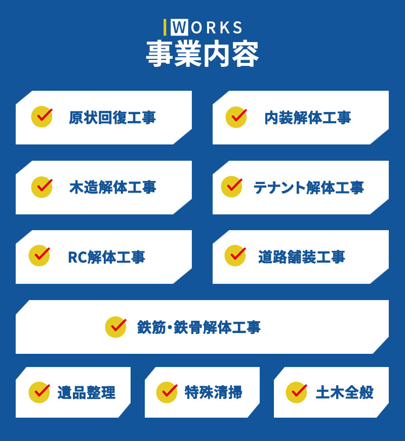 - A工事した際に、万が一建物内部の損傷や見積範囲外の工事が出てきてしまった場合、 その工事費用として、別途費用を別途請求させて頂く場合があります。また、見積もり作成時点になかった処分品が増えていた場合も別途追加される場合があります。