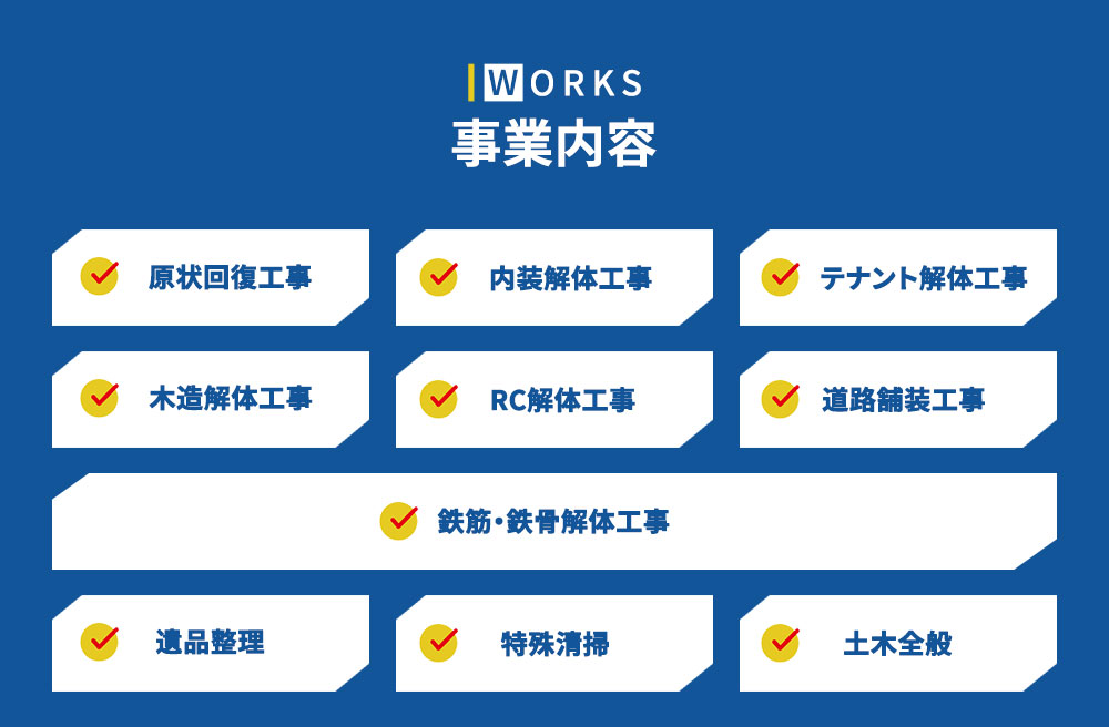 - 建物構造種別・解体作業・近隣環境・搬入ルート確認・隣接境界確認・地中物の有無を確認。